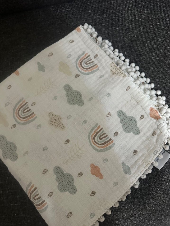 Sayılı kez kullanıldı ütülü şekilde kullanım sağlandı tertemiz şekilde duruyor sıkıntısızdır Yumuşak pamuktan yapılmış, nakışlı bulut ve gökkuşağı desenli, pastel renklerde çocuk battaniyesi. Kenarları ponpon detaylıdır.
