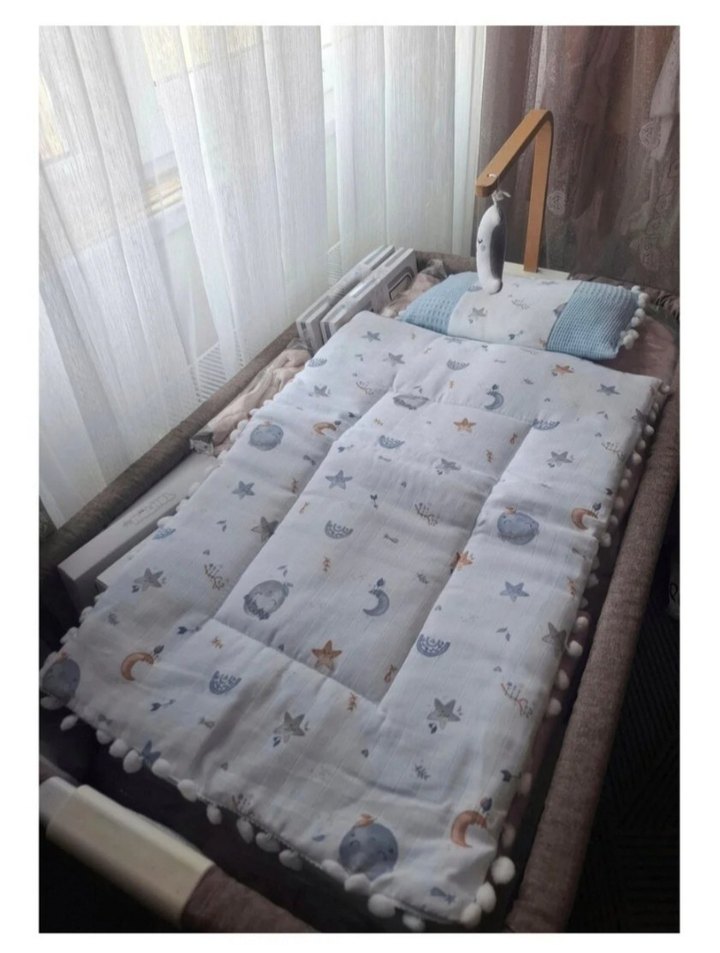 Müslin kumaştan üretilmiş olup, çift taraflı olarak kullanılabilmektedir. Yastığı bulunmaktadır.