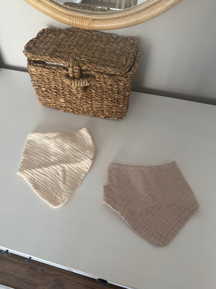 Desensiz, yumuşak dokulu, açık bej renkli iki adet bebek önlüğü seti.