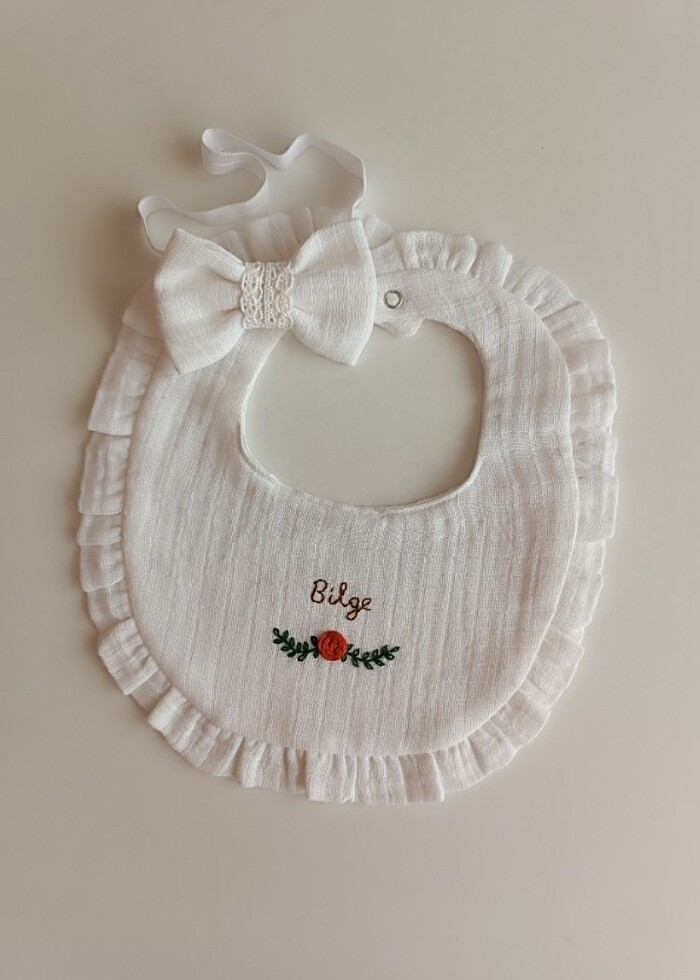 Özel günlerde, fotoğraf çekimi veya mevlüt gibi etkinliklerde kullanmak için nakışlı bebek önlüğü