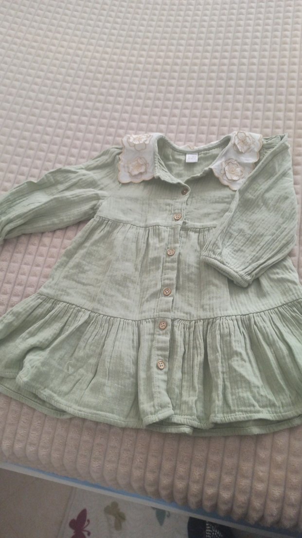 Uzun kollu, düğmeli, yakasında çiçek nakışı Müslin kız elbise