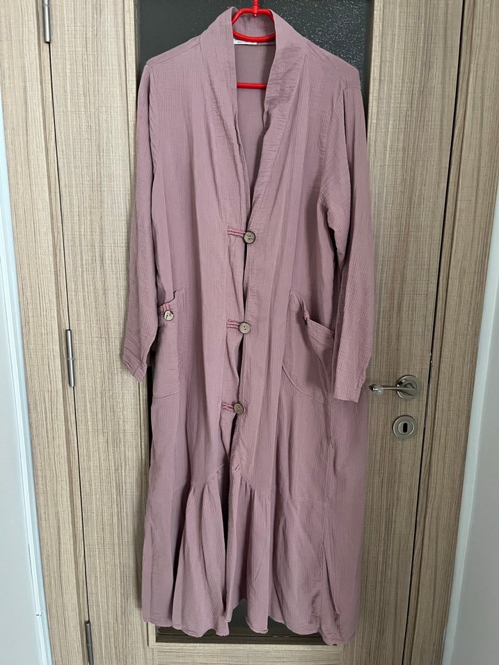 %100 müslin kumaştır, gül kurusu renginde, giy çık rahat bir üründür. standart beden olduğu için 36-44 beden aralığında uygundur. Dökümlü güzel bir duruşu var. Bir kaç kez kullandım tertemiz üründür. İhtiyaç fazlası olduğu için satıyorum