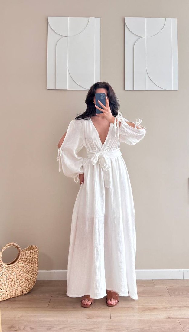 Yumuşak müslin kumaştan, bol kesim beyaz uzun elbise. V yaka ve ip detaylı kollarıyla bohem tarzı yansıtır.