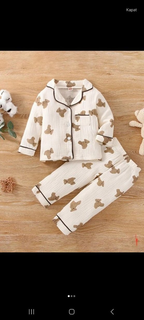 Pamuk kumaştan yapılmış uzun kollu bebek takim düğmeli ve yakalıdır. Açık krem renkli ayıcık desenleriyle organik urun ve geceleri rahat uyuyabilecegi cok kullanislı otganik takim