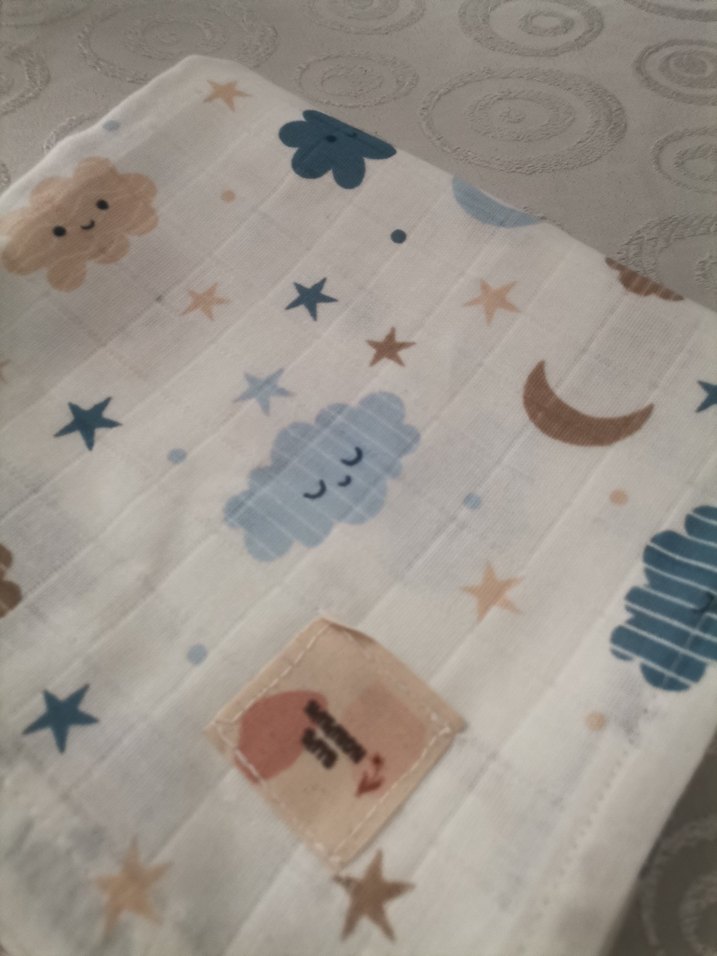 Beyaz zemin üzerine renkli bulut Ay yıldız desenli %100 pamuk çok amaçlı kullanılır 93×91ebadında yeni dikildi