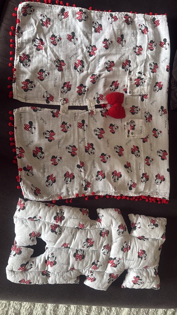 Nakışlı desenlerle süslenmiş beyaz çocuk uyku seti, kırmızı ponpon detaylıdır. İçinde dolgulu parça ve kırmızı fiyonk detaylı aksesuar bulunur. ️önü çıtçıtlı