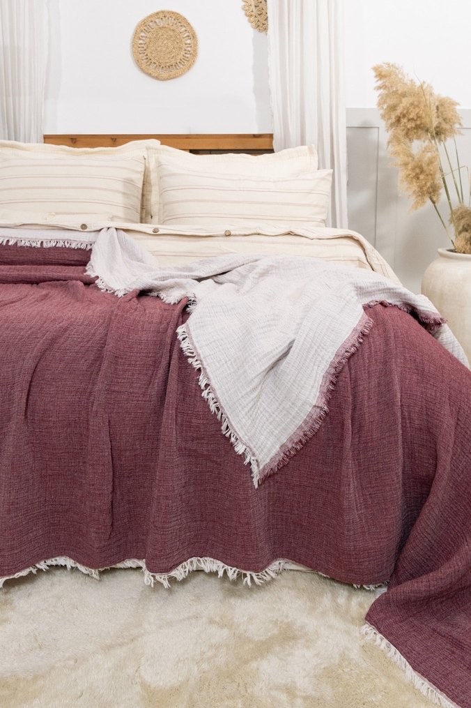Bordo ve gri renklerde, düz desenli ve püsküllü kenarlara sahip çift taraflı yatak örtüsü, yatak odanıza sıcaklık katar. ️ 260x280 battal ebatiyla evinizde büyük rahatlik. kahve ve gorseldeki renk mevcut. 4 kat müslin