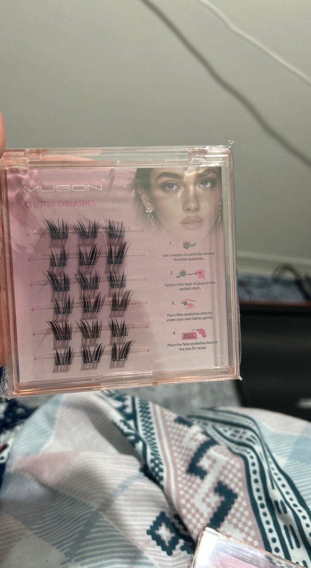 Pembe renkli, koyu uçlu küme takma kirpikler. Şeffaf kutuda ve kullanım talimatlarıyla birlikte sunulur.
