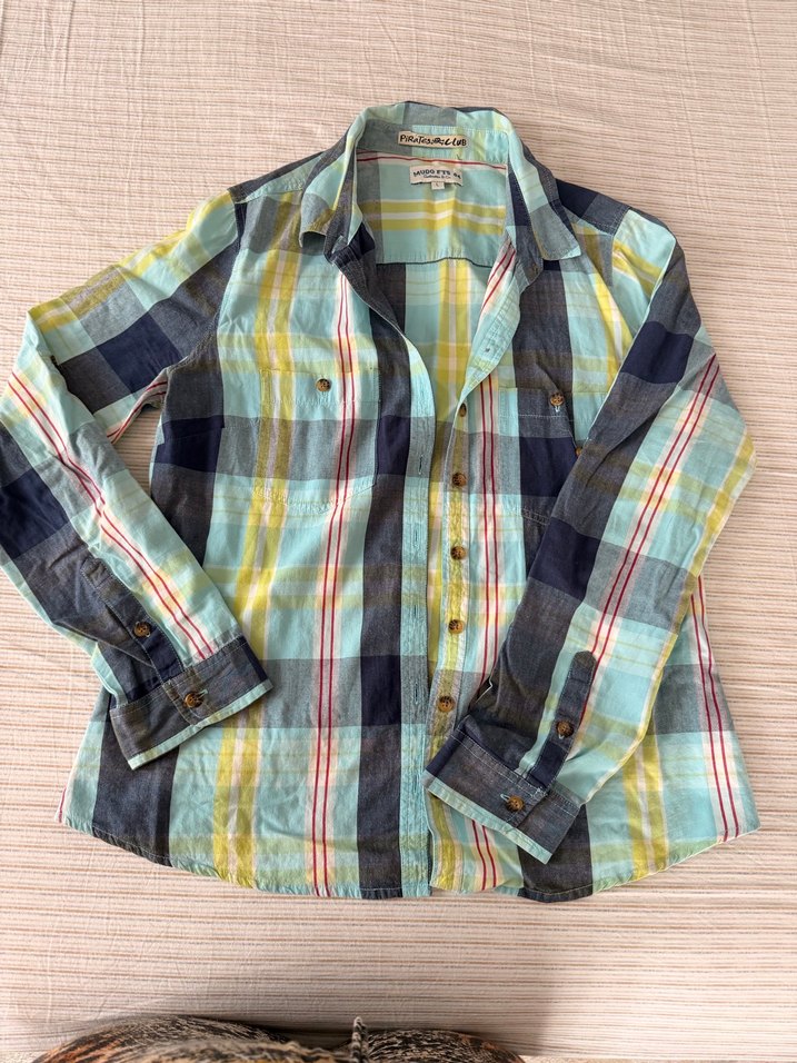 Uzun kollu, düğmeli, çok renkli pastel tonlarda pamuklu kadın gömleği. Rahat kesimi ve yakasıyla gündelik kullanıma uygundur.