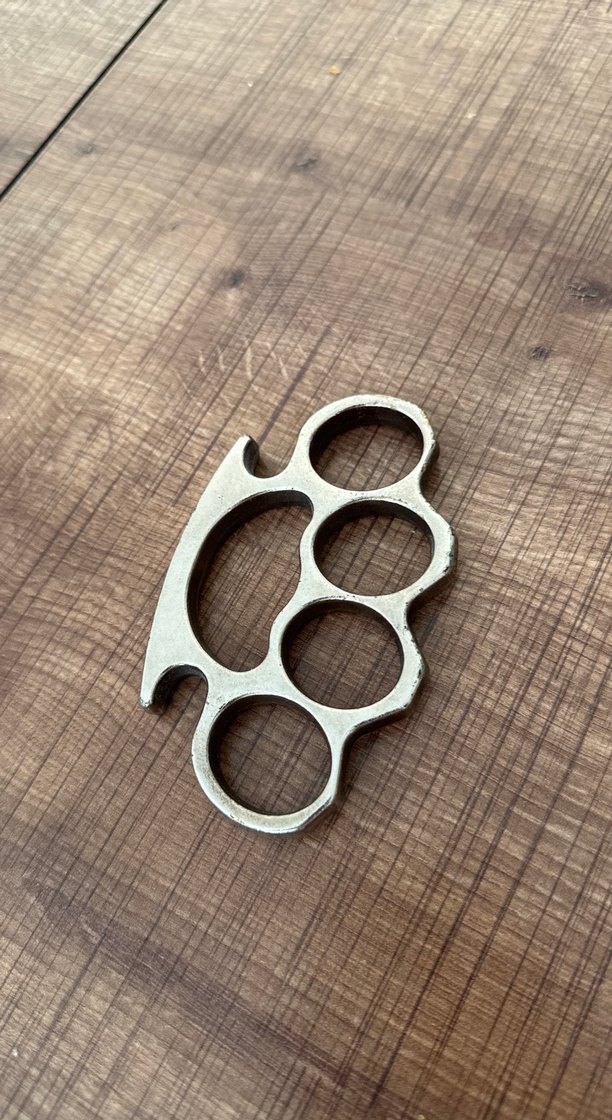 Gri ve bej renklerde metalden yapılmış, grunge punk kültüründen ilham alan sert tasarımlı parmaklık.