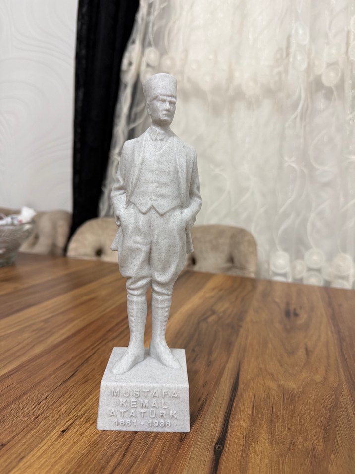Gri ve beyaz renkte, elleri cebinde duran Mustafa Kemal Atatürk figürü. Üzerinde adı ve yaşam yılları (1881-1938) yazılı kaide bulunur. Sıfır ürün 25 cm boyutunda istenilen renk yapılır