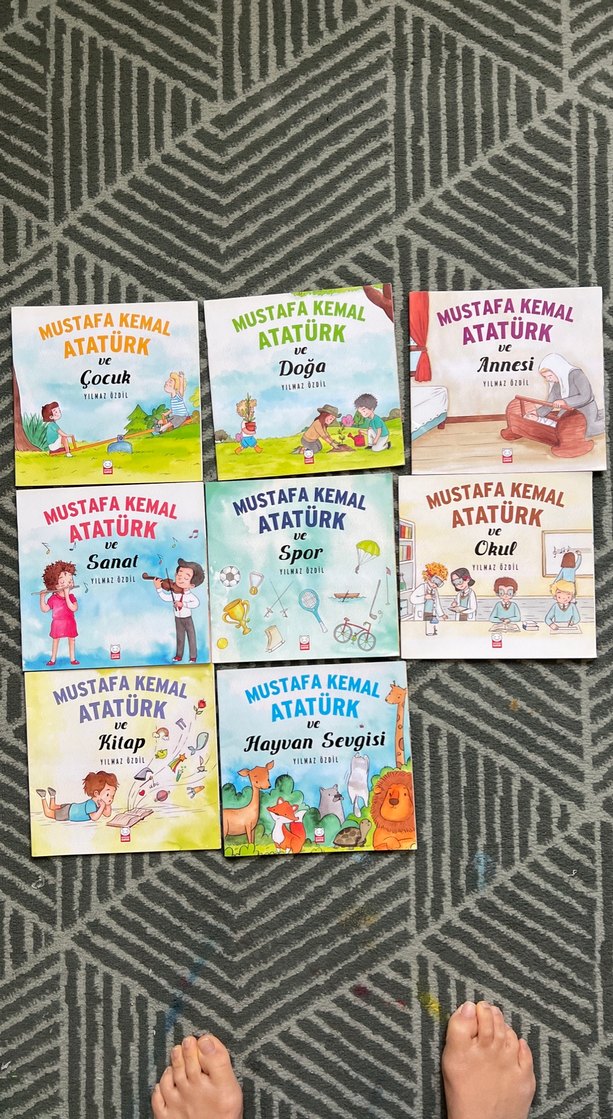 Mustafa Kemal Atatürk temalı çocuk kitap seti; çocuk, doğa, annesi, sanat, spor, okul, kitap ve hayvan sevgisi konularını içerir.