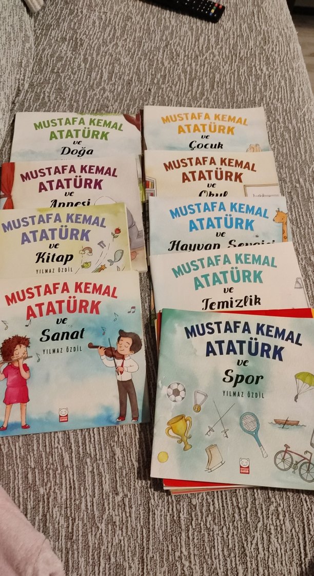 Mustafa Kemal Atatürk temalı spor, sanat, doğa, temizlik ve hayvanlar gibi konuları içeren çocuk kitapları seti.