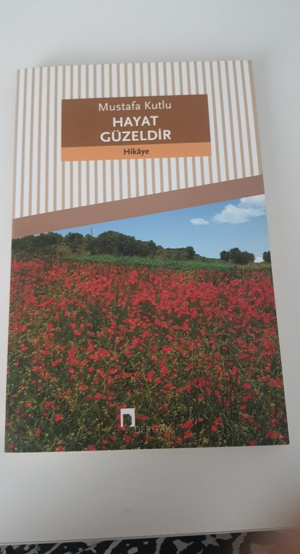 Mustafa Kutlu'nun "Hayat Güzeldir" adlı hikaye kitabı, canlı kırmızı çiçeklerle dolu bir tarlayı ve mavi gökyüzünü gösteren kapak tasarımına sahiptir.