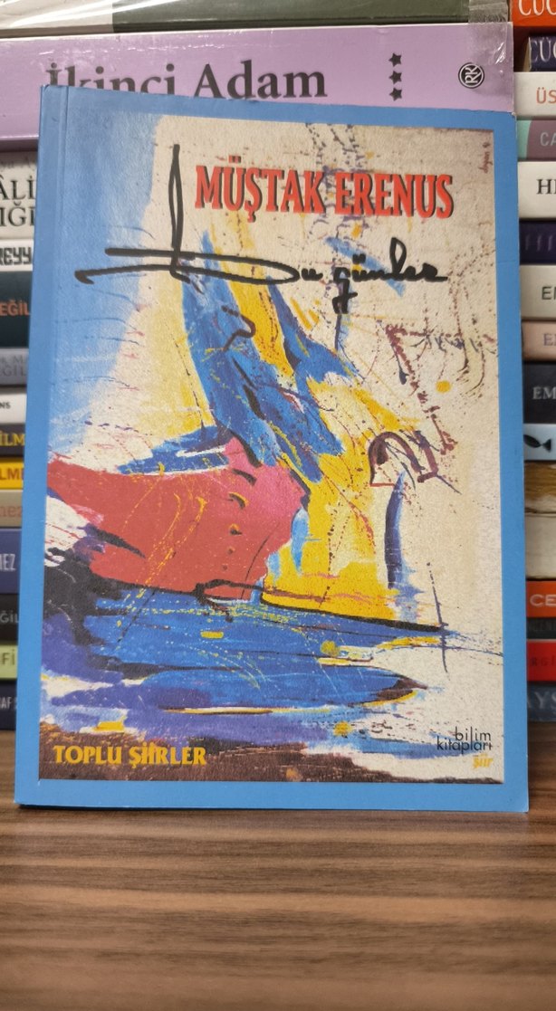 Müştak Erenus'un şiirlerinden oluşan bir toplu şiir kitabı, renkli soyut kapak tasarımıyla.
