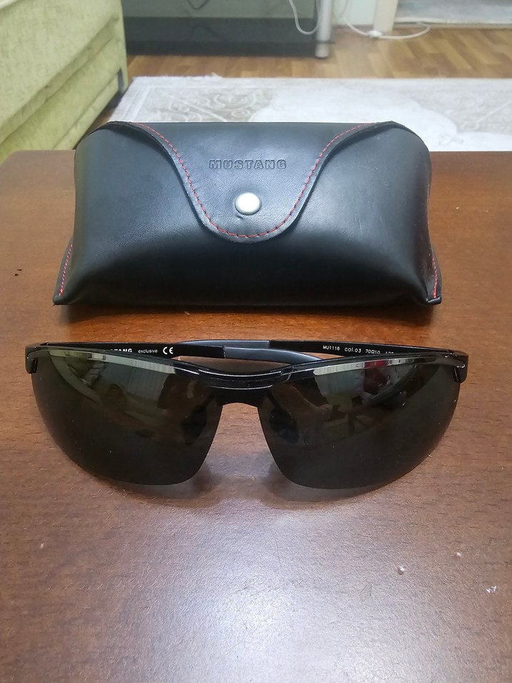 Mustang markasina ait, hic kullanilmamis erkek, Koyu renk camlı, siyah biker tarzı minimalist güneş gözlüğü. Kırmızı dikişli siyah kılıf ile birlikte, zahmetsiz şıklık sunar. ️