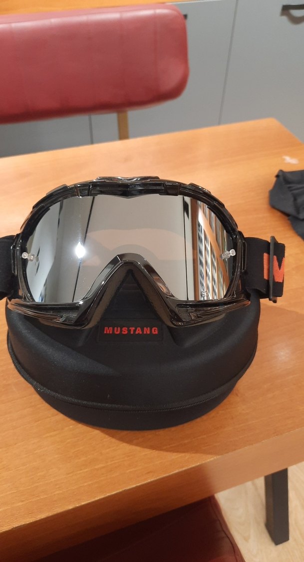 Mustang logolu, siyah renkli, tokalı kayışa sahip erkek kayak gözlüğü. Yumuşak ve sıcak kumaştan yapılmış, baskılı tasarım sunar. Minimalist biker tarzına uygundur.