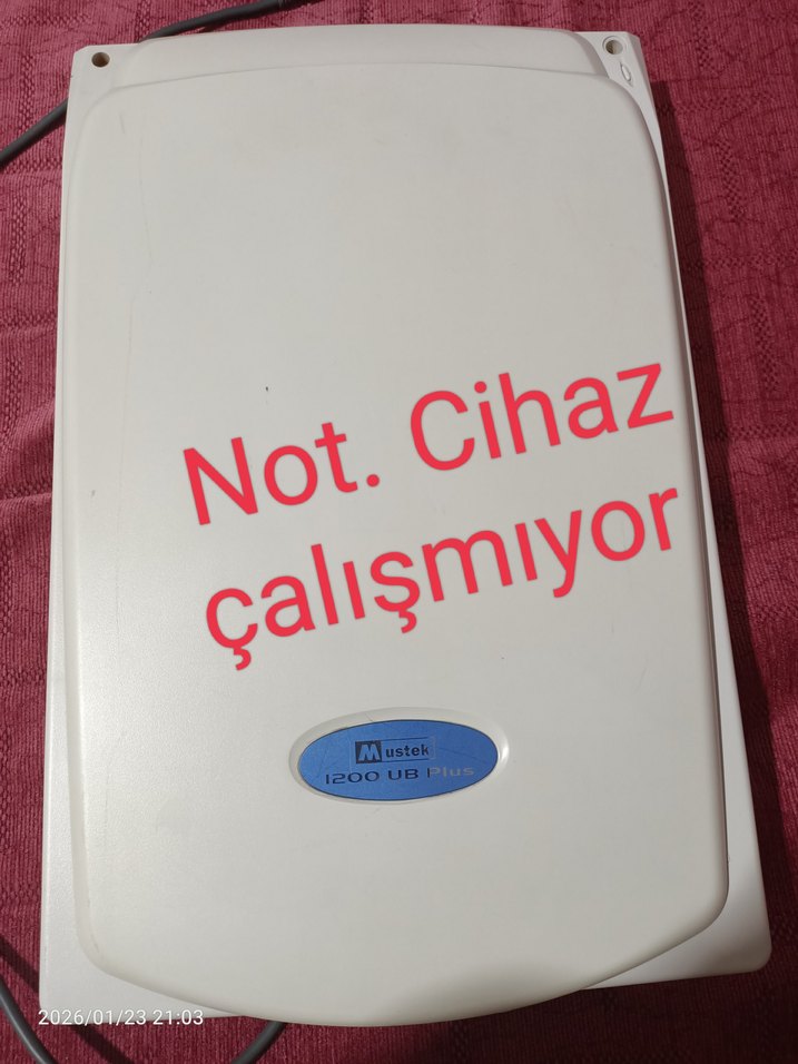Mustek 1200 UB flatbed tarayıcı. Ürün çalışmıyor kırık, bozuk değil çalışmama sebebi bilinmiyor parça niyetine yada tamir ettirip kullanılan bilir beyaz renkte olup, net ve hafif tarama özelliği sunar, belgeler ve fotoğraflar için uygundur.