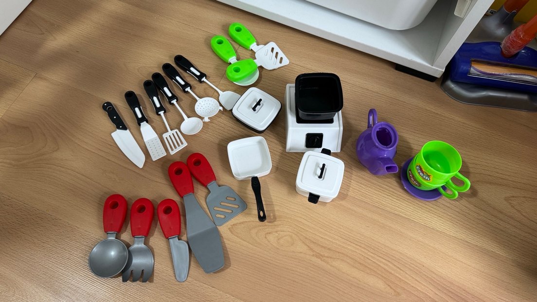 Koyu ve beyaz renklerde çeşitli mini mutfak gereçleri ve aletleri içeren oyuncak seti.
