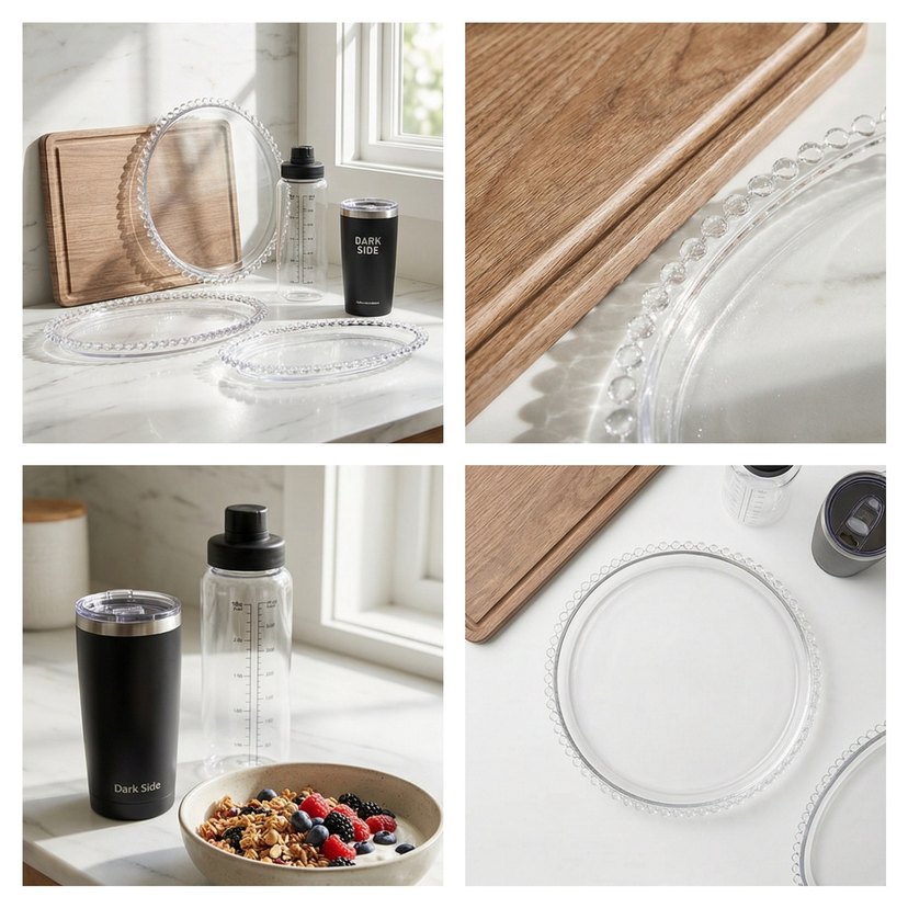 ️✨Mutfak Seti✨️ Set halinde satılıktır. Şık, kullanışlı ve hediye etmeye uygundur Set içeriği: • Boncuk detaylı şeffaf cam servis tepsi ❤️ Zarif boncuk detaylı kenarlarıyla sofralarınıza şıklık katar. Kahvaltı, tatlı, meyve ve ikram sunumları için ideal. Minimal ve modern tasarımıyla hem günlük hem özel davetlerde kullanıma uygundur. Zarif boncuk detaylarıyla modern tasarım • Dark Side Termos / Kupa❤️ Kahve ve sıcak içecekler için, minimal ve şık tasarım Kapaklı, taşınabilir, günlük kullanım için uygun Sıcak içecekler için kapaklı kullanım • Cam / Seramik Yağdanlık ❤️ Şık ve kullanışlı tasarımıyla sofranıza ve mutfağınıza zarif bir dokunuş Zeytinyağı, sirke veya sosları saklamak ve dökmek için ideal Minimal ve modern görünüm, hem dekoratif hem işlevsel Bakım: Kolay temizlenir, elde veya bulaşık makinesinde yıkanabilir • Kesim panosu ahşap kesme–sunum tahtası❤️ Doğal ahşap malzeme, dayanıklı ve uzun ömürlü Bakım: Hafif nemli bezle sil, uzun süre kullan