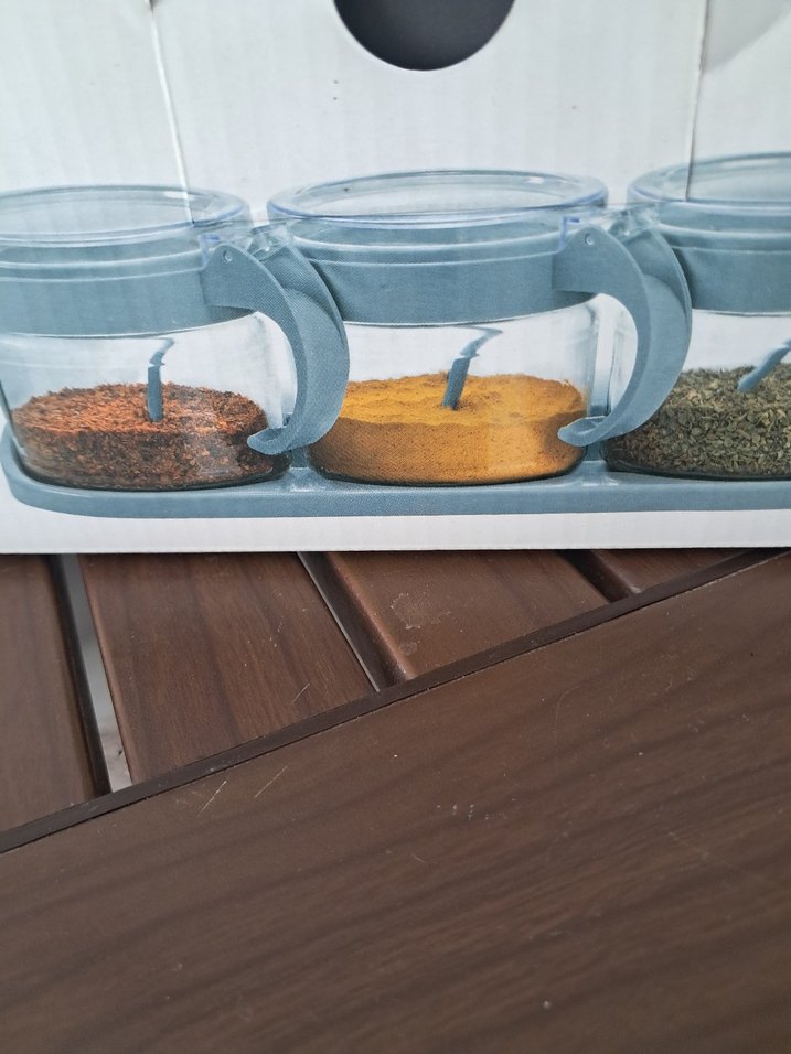 üç adet saplı mavi-gri baharat kabı içeren mutfak aksesuar seti. hiç kullanılmadı