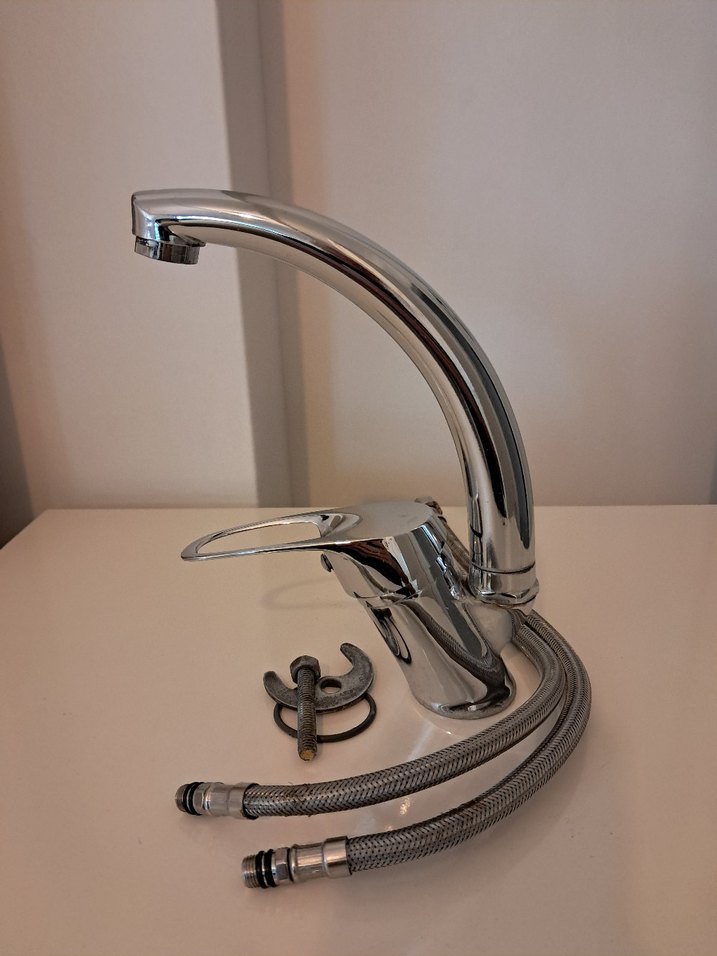 Kavisli musluk ve esnek hortumlardan oluşan gri mutfak musluğu seti, kolay montaj için uygundur.