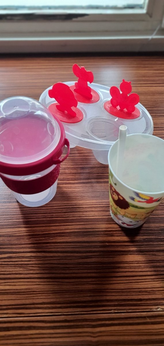 Kırmızı kulplu renkli dondurma kalıbı ve hayvan desenli pipetli çocuk bardağı, fit yiyecek hazırlama kabı, hepsinin fiyatıdır.