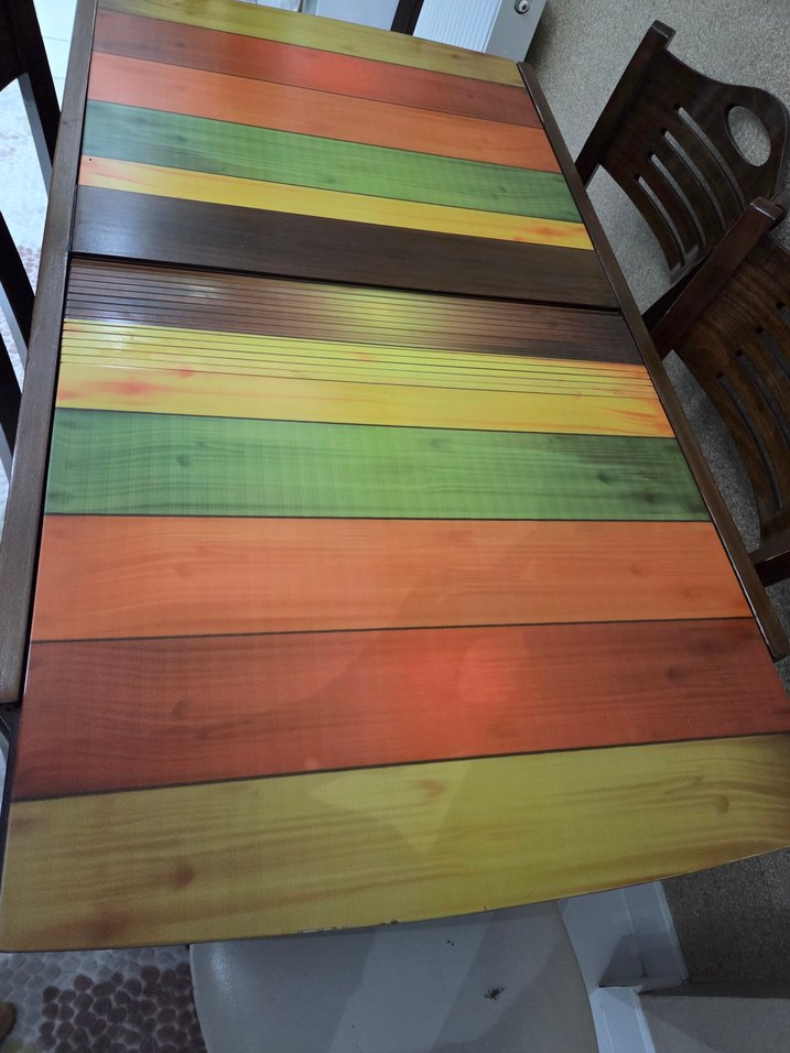 çok renkli, koyu tonlu ahşap yüzeye sahip Dayanıklı ve eğlenceli bir mobilyadır.