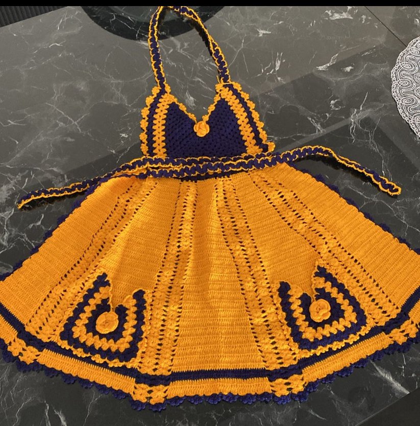 Nakışlı detaylara ve tığ işi tasarıma sahip koyu sarı mutfak önlüğü, işlevselliği dekoratif dokunuşla birleştirir.