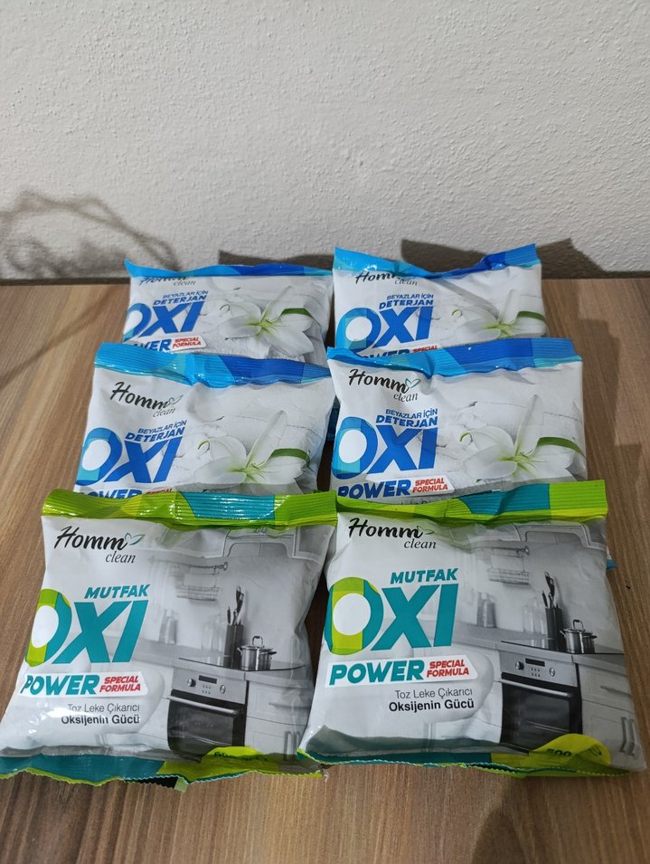 Oksijen gücü içeren beyaz mutfak temizleme tozu, etkili leke çıkarma sağlar. Çoklu paket halinde sunulur.