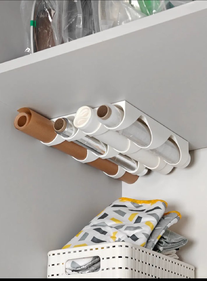 Beyaz tavan rafı, rulo saklama için tasarlanmıştır ve dolap veya mutfaklarda alan tasarrufu sağlar.