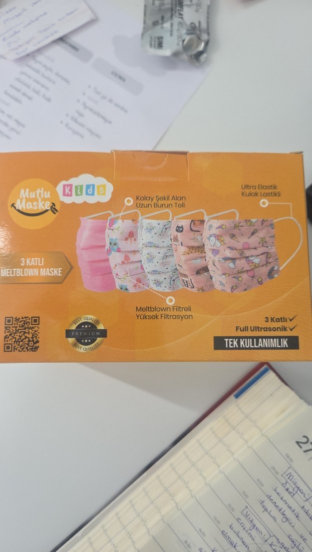 Mutlu Kids 3 katlı tek kullanımlık çocuk maskesi, yüksek filtrasyonlu meltblown filtre içerir. Uzun burun teli ve ultra elastik kulak lastiğine sahiptir.
