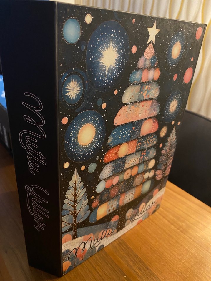 Renkli yıldızlı desenlerle süslenmiş, yılbaşı ağacı ve gök cisimlerini içeren şık bir kapak tasarımına sahip sanat kitabı.