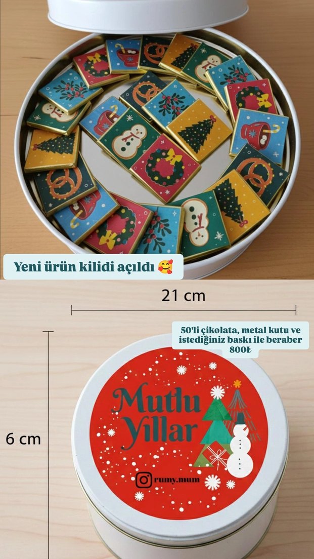 21 cm x 6 cm metal kutuda 50 adet farklı baskılı çikolata içerir. "Mutlu Yıllar" temalı, baskı seçeneği de mevcuttur.