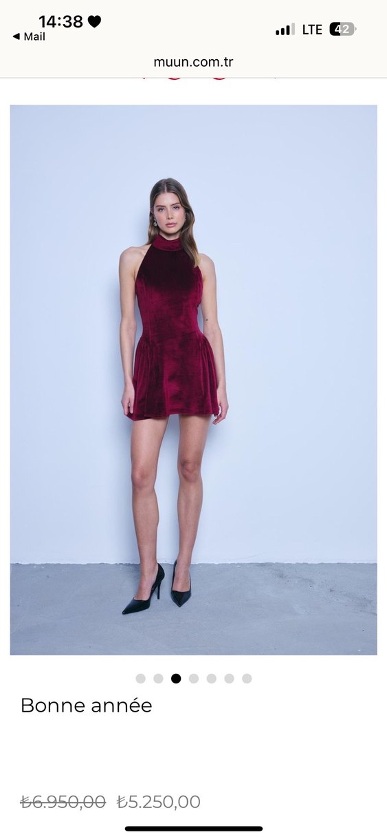 Bordo renk, halter yaka ve piliseli etek detaylı, vücuda oturan mini elbise. Yumuşak sentetik kumaştan üretilmiş, romantik akşamlar, yeni yıl ruhu için uygun.