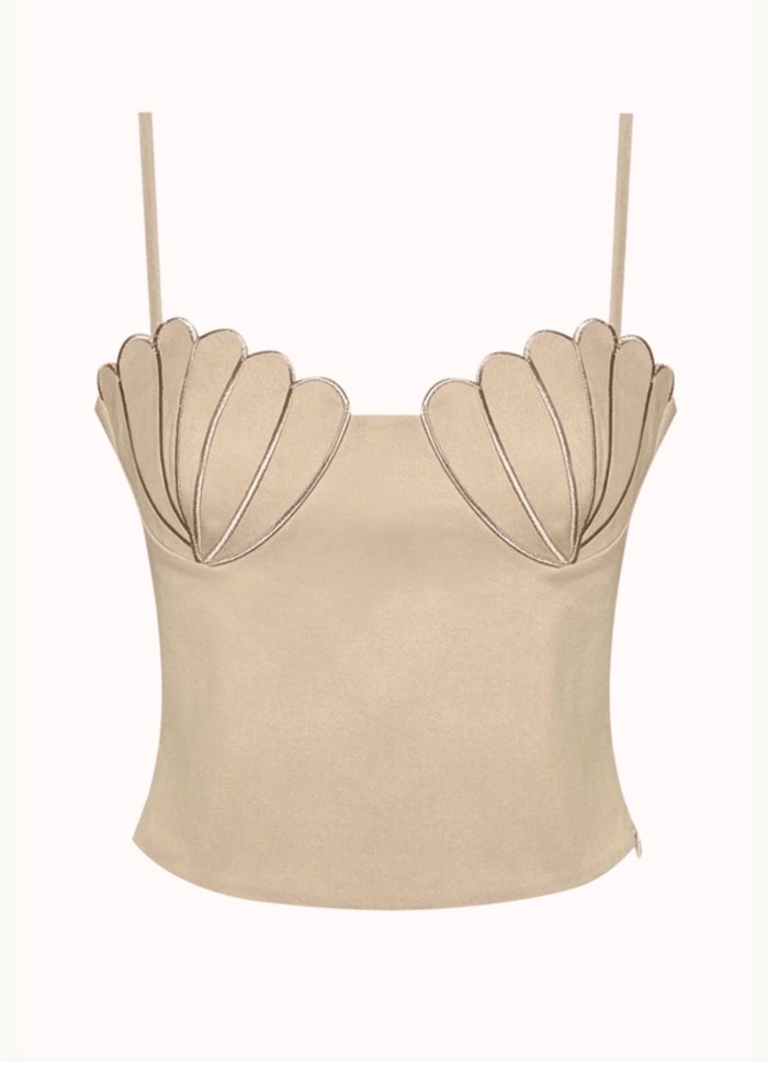 Bej renkli, deri malzemeden yapılmış, işlemeli ve pile detaylı, ince askılı, mini uzunlukta ve vücuda oturan straplez bustiyer.