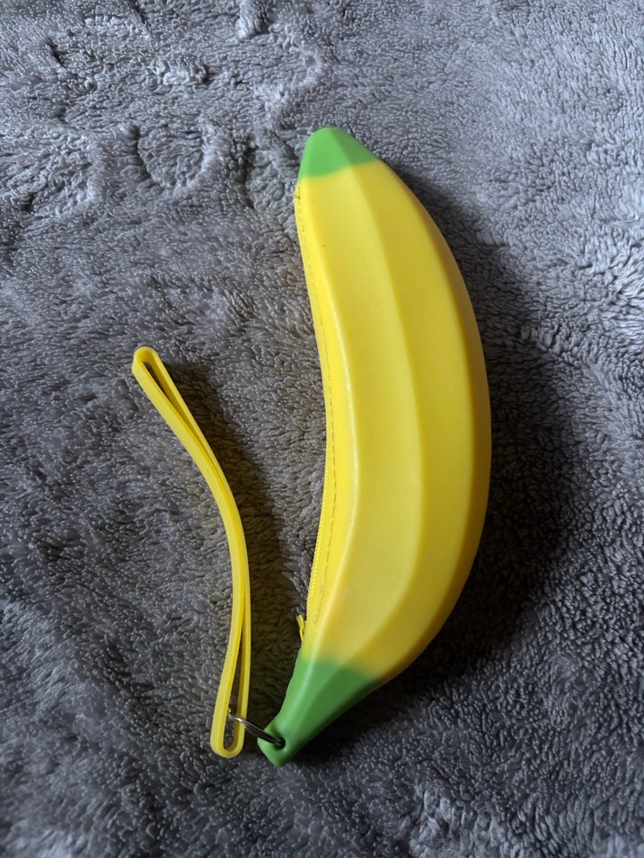 Muz şeklinde, canlı sarı ve yeşil uçlu, renkli baskılı kalemlik. Kolay asma için kayışlıdır.