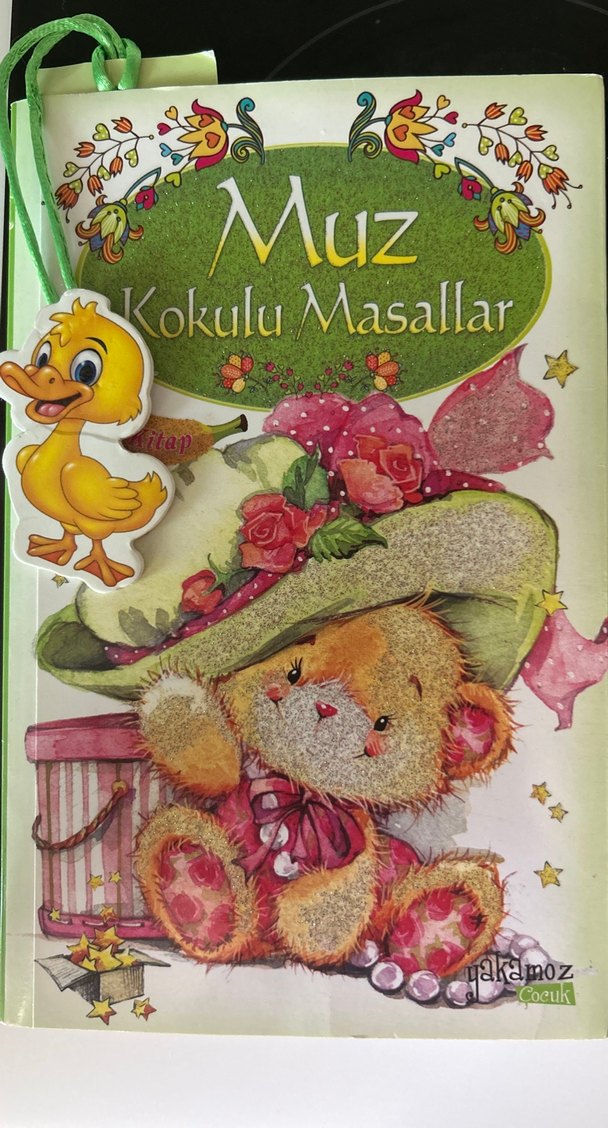 Sevimli ayıcık ve ördek figürlü, çocuklar için 'Muz Kokulu Masallar' adlı resimli kitap.