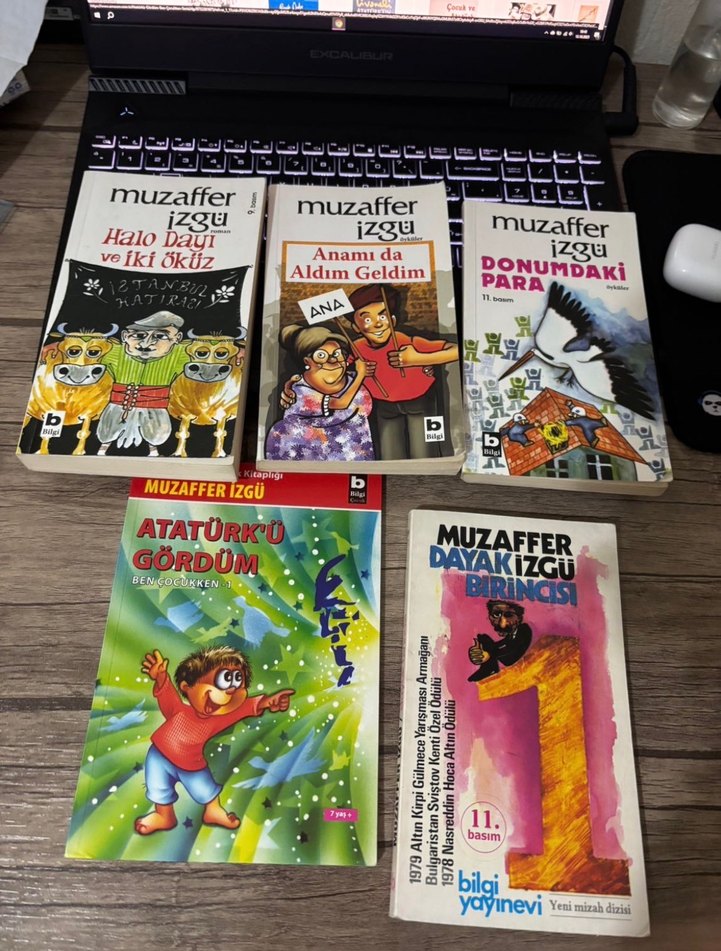 Muzaffer İzgü'nün 'Halo Dayı ve İki Öküz', 'Anamı da Aldım Geldim' ve 'Donumdaki Para' gibi kitaplarını içeren çocuk kitapları seti. Sayfaları iyi durumda.