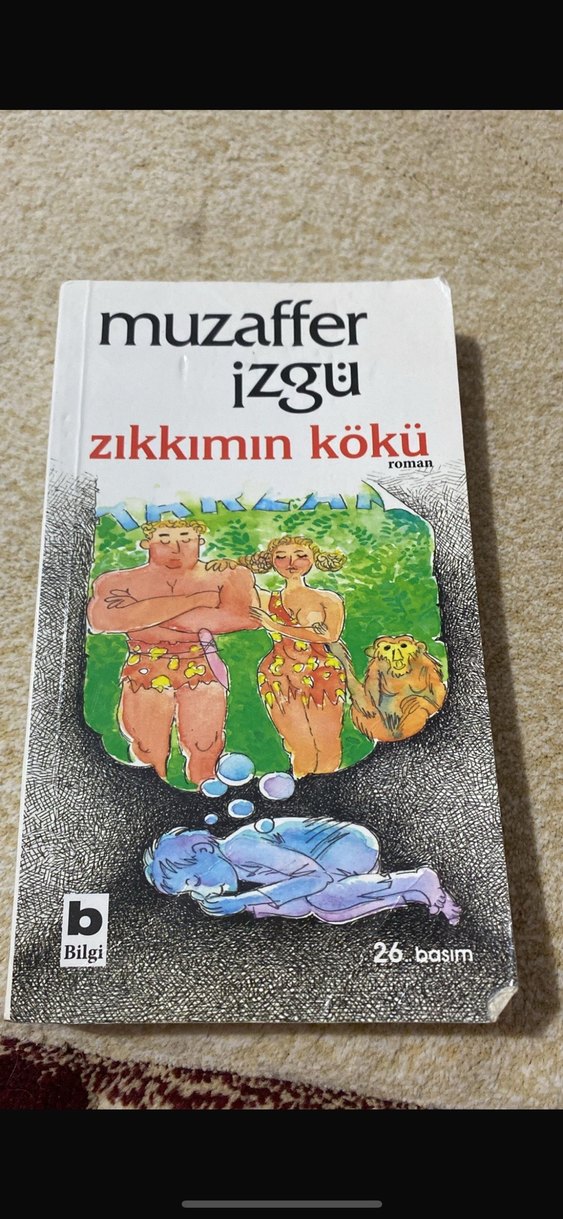 Muzaffer İzgü'nün mizah türündeki 'Zıkkımın Kökü' adlı romanı, Bilgi yayınevinin 26. basımıdır. Renkli kapak çizimi bulunmaktadır.