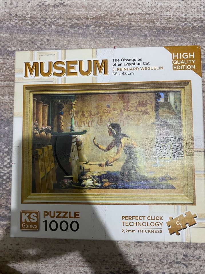 Parlak altın renkli 1000 parça puzzle, J. Reinhard Weguelin'in 'Mısır Kedisi Cenazesi' tablosunu içerir. 68x48 cm boyutunda, 2,2 mm kalınlık ve mükemmel tıklama teknolojisi sunar.