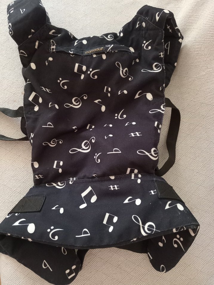 Ayarlanabilir kayışlara sahip, beyaz müzik notaları desenli siyah bebek taşıyıcı. Rahat ve kullanışlıdır.sifir ayarinda az kullanilmis.