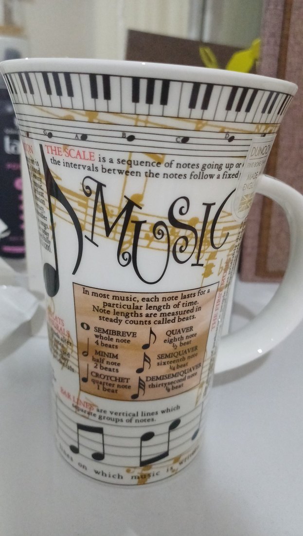Renkli müzik notaları ve piyano tuşları desenli beyaz kupa, üzerinde SEMIBREVE ve QUAVER gibi müzik terimleri yer alıyor .
