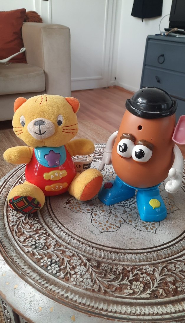 ABC ve 123 düğmeli renkli peluş kedi oyuncağı ile siyah şapkalı, mavi ayakkabılı plastik patates figürü bir arada. Canlı ve eğlenceli oyuncaklar. tanesi 100