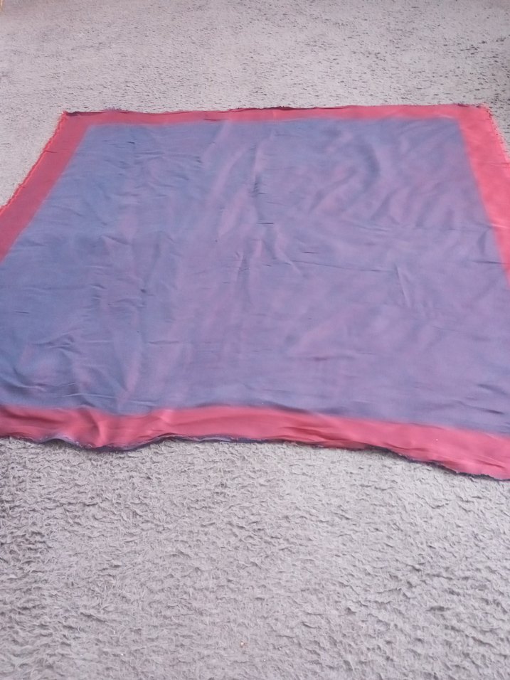 mavi orta kısmı ve kırmızı kenarı olan, desen içermeyen yumuşak bir baş örtüsü Konfor ve hafif renk kontrastı sunar. ️