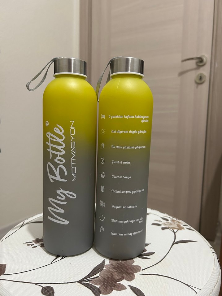 My Bottle marka, üzerinde motivasyonel yazılar bulunan gri-khaki renk geçişli su şişesi. Metal kapak ve taşıma kayışı mevcuttur.