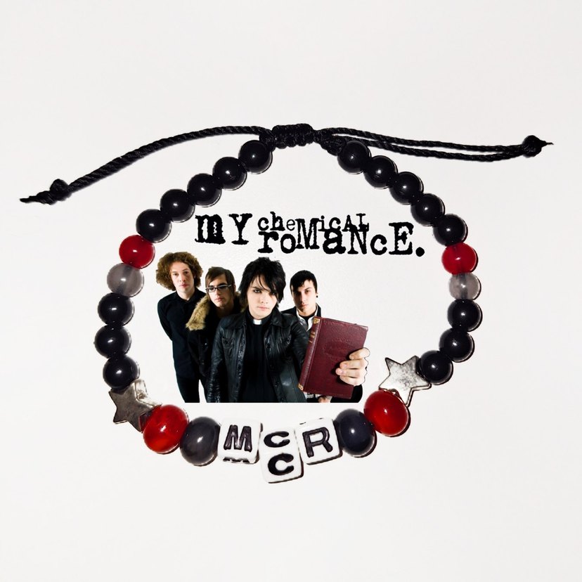 My Chemical Romance siyah boncuklu, kırmızı gri ve gümüş detaylı, yıldız figürlü ayarlanabilir ipten bileklik