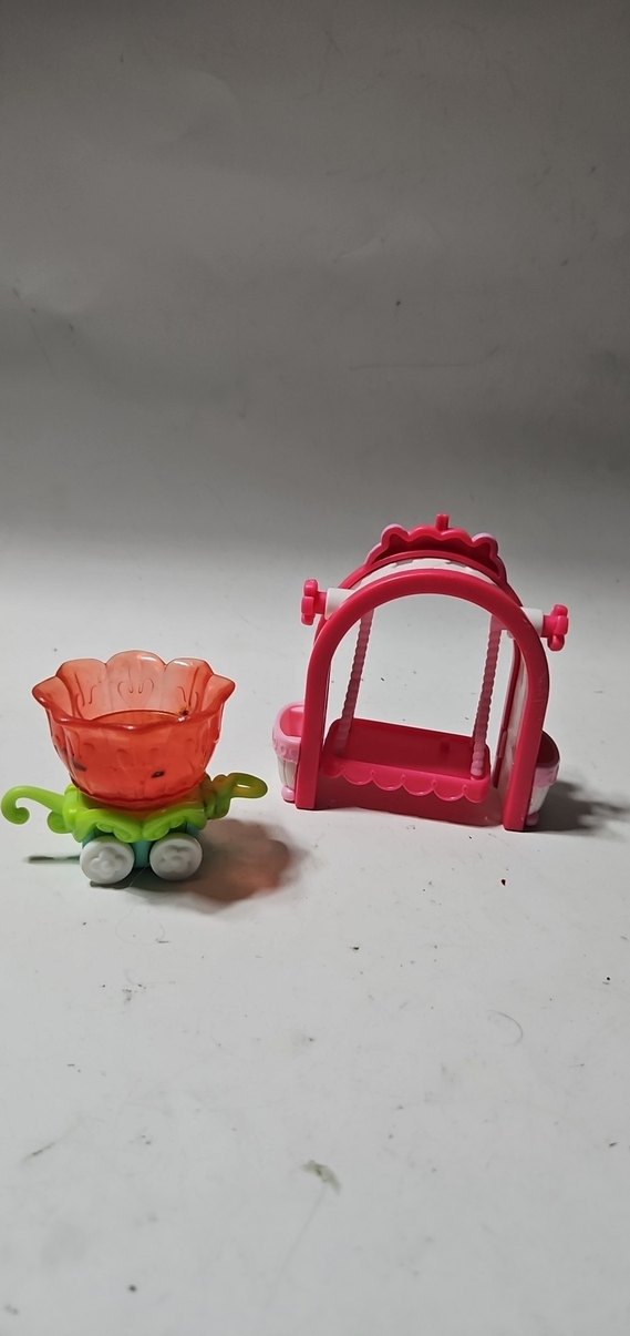 Pembe renkli, plastikten yapılmış salıncak ve çiçek şeklinde tekerlekli oyuncak araba seti. 2 sini fiyatı