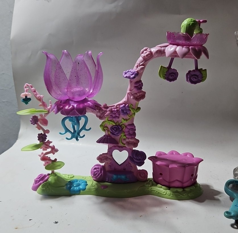 Renkli mor oyuncak seti, büyük çiçek ve sallanan parçalar dahil olmak üzere çiçek temalı çeşitli interaktif detaylar içerir.