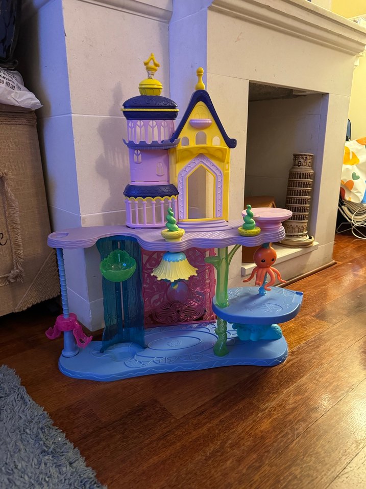 Pastel renklerde çok katmanlı oyun evi oyuncak, kaydıraklar ve küçük figürler içerir. Kalesi andıran tasarımıyla etkileşimli parçalara sahiptir.
